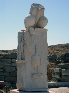 The giant statue of a phallus, left, is from the Greek island of Delos at the sanctuary of Dionysos, the Stoivadeion (image from the Wikimedia Commons).